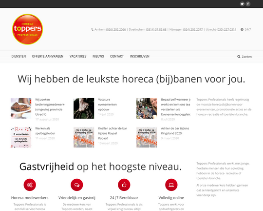 Toppers Professionals is meer dan alleen een uitzendorganisatie; het is een strategische partner voor bedrijven in de horeca en daarbuiten. Met een brede waaier aan diensten, van horecapersoneel tot chauffeursdiensten en personeelsbeheer, biedt Toppers een unieke mix van expertise, flexibiliteit en klantgerichtheid. De toewijding aan kwaliteit en innovatie maakt Toppers tot een betrouwbare en gewaardeerde partner voor een breed scala aan opdrachtgevers. Door zich continu te focussen op de behoeften van hun klanten en de marktontwikkelingen, blijft Toppers Professionals zichzelf vernieuwen en verbeteren, wat hen tot de toppers in hun veld maakt.